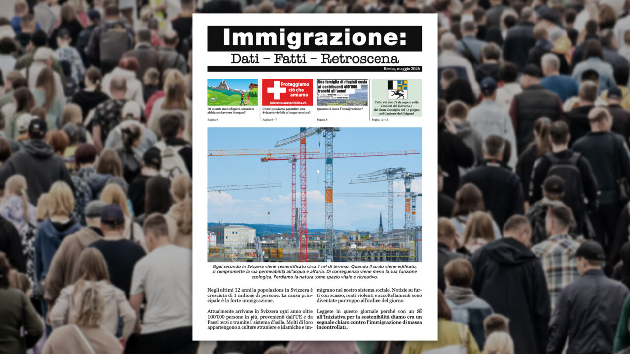 Leggete perché il 14 giugno è assolutamente necessario votare SÌ all’iniziativa popolare «No a una Svizzera da 10 milioni!». Il giornale della votazione illustra, con dati, fatti e approfondimenti, quali conseguenze ha l’immigrazione sfrenata per il nostro Paese e la nostra società. Ad esempio, sapevate che gli affitti stanno esplodendo nonostante la massiccia attività edilizia, o ancora, che ogni secondo viene cementificato 1 metro quadrato di terreno? Scoprite perché il livello di istruzione nelle nostre scuole sta calando e quanto ci costa la criminalità importata. E verrà rivelato perché i contribuenti di Wattwill (SG) devono pagare 400’000 franchi all’anno per una sola famiglia di richiedenti asilo.