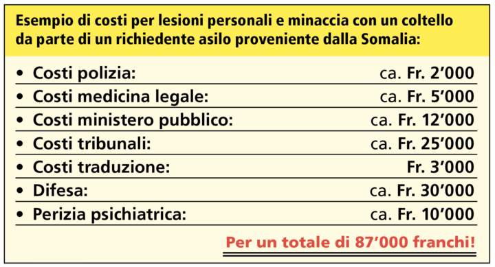 La popolazione svizzera paga questa politica d’asilo «di benvenuto» sia con la propria sicurezza, sia in termini finanziari: la Confederazione da sola spende ormai 4 miliardi per il settore dell’asilo (oltre 1’700 franchi di imposte per una famiglia di quattro persone). A ciò si aggiungono i costi per la polizia, il perseguimento penale e l’esecuzione delle pene.