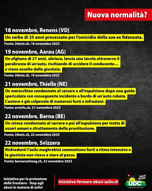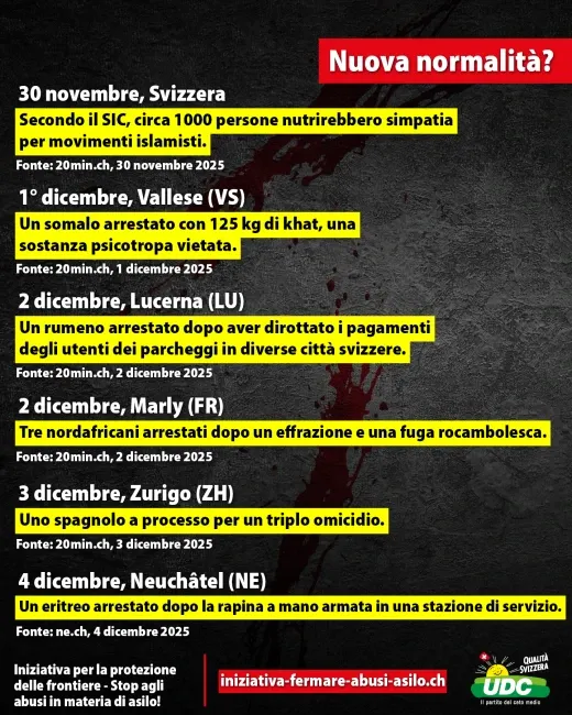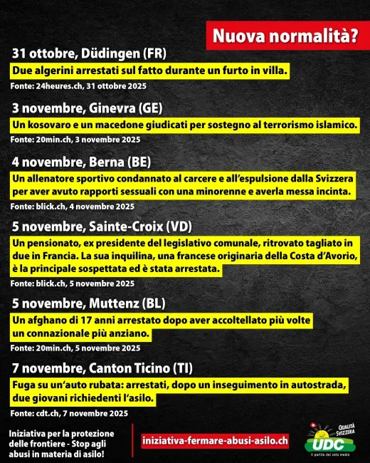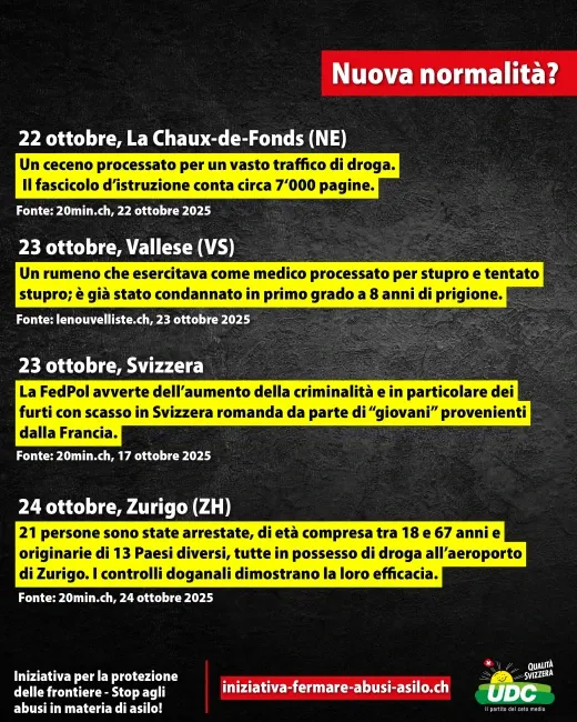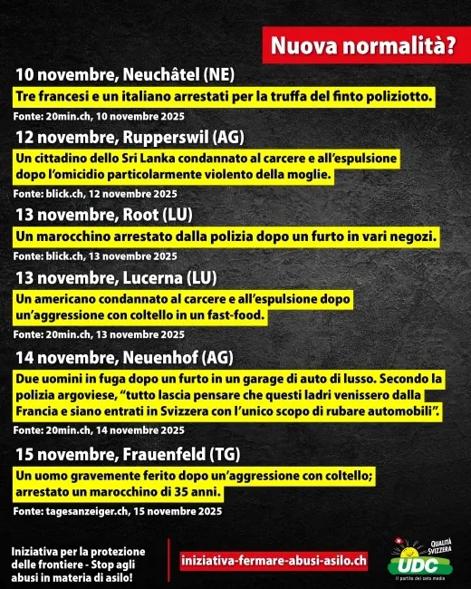 La Svizzera sta diventando sempre meno sicura, a causa della criminalità che sfrutta una politica d'immigrazione lassista e frontiere spalancate. L'UDC è l'unico partito realmente impegnato a contrastare l'immigrazione di massa e a proteggere i nostri confini. https://iniziativa-fermare-abusi-asilo.ch/