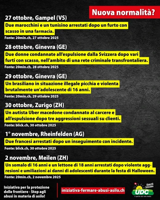 La Svizzera sta diventando sempre meno sicura, a causa della criminalità importata che approfitta di una politica d'immigrazione lassista e frontiere spalancate. L'UDC è l'unico partito realmente impegnato a contrastare l'immigrazione di massa e a proteggere i nostri confini. https://iniziativa-fermare-abusi-asilo.ch/