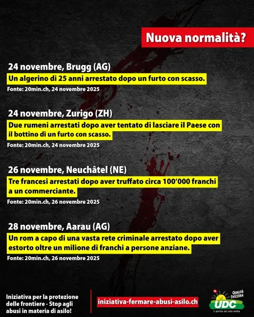 La Svizzera sta diventando sempre meno sicura, a causa di una criminalità importata che approfitta di una politica di immigrazione lassista e di frontiere spalancate. L'UDC è l'unico partito realmente impegnato a contrastare l'immigrazione di massa e a proteggere i nostri confini. Firma ✍🏼 subito l'iniziativa 👉🏼 iniziativa-fermare-abusi-asilo.ch